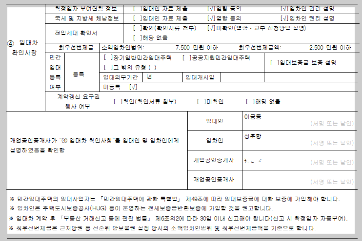 이러한 사항을 모두 확인하고 임대인, 임차인, 그리고 공인중개사가 확인을 했다고 하는 서명을 해야 합니다.