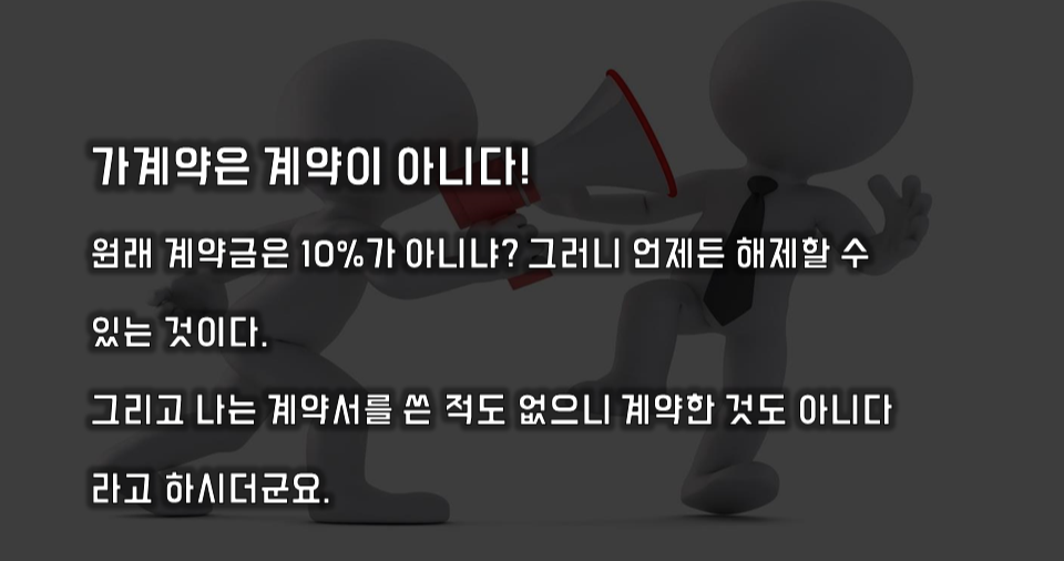 아울러 매도인은 가 계약금을 받을 경우 이러한 사항을 유의하여 구두나 문자상으로라도 계약의 중요사항을 반드시 특정하여 계약이 무산되는 일이 없도록 주의 하시기 바랍니다.